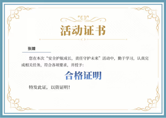 活动面向全体在校学生,持续开展7天,要求每位学生每日进行至少10分钟的安全知识学习,坚持连续学习满7天后,系统将自动为其生成“学习结业证书”,作为参与本次安全教育活动的有效证明。
