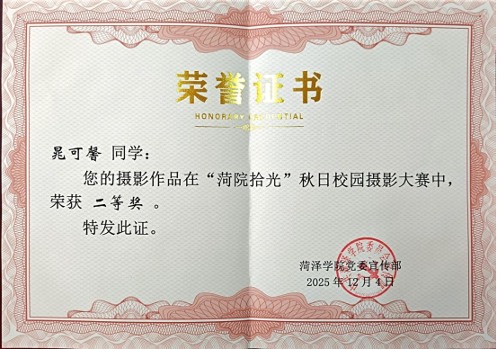 近日,由qy球友会党委宣传部主办的“菏院拾光”秋日校园摄影大赛圆满收官,qy球友会学生晁可馨的作品《校园秋语》凭借对秋日景致的独特诠释与扎实的摄影功底脱颖而出,荣获学生组二等奖。用镜头为分校赢得了荣誉。